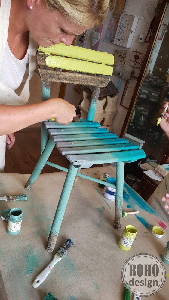 Alapvetően én nem nyúlok bele a munkádba, ez szerintem nagyon fontos. Megmutatom, hogyan kell festeni, esetleg a szék lábán elkezdem, de folytatni és befejezni te fogod. Úgy mész haza, hogy te festetted. Úgy mész haza, hogy megtanulsz technikákat, trükköket. Úgy, hogy otthon, bármikor újra tudod festeni akár a többi bútorodon!