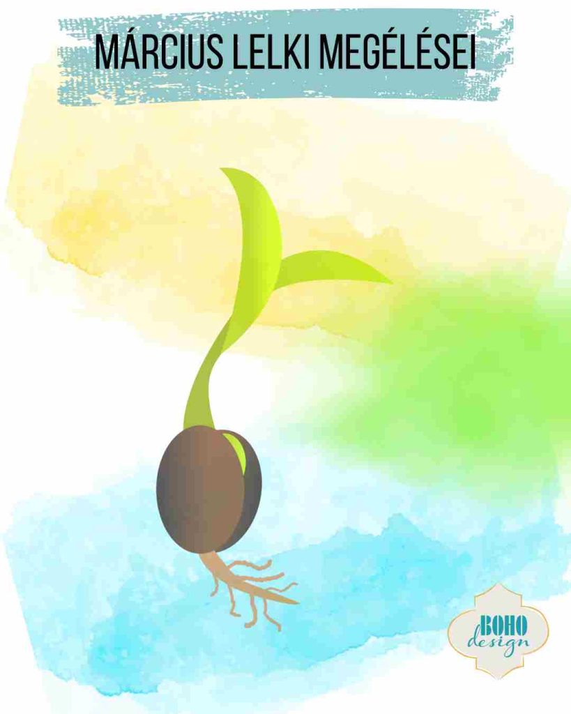 Ahogy a mag a földben, februárban erejét gyűjtögetve várakozott, úgy várakozott és erősödött a saját belső magunk is. És most a víz (kék) és a fény, meleg (sárga) segítenek neki a növekedésben, burkának megrepesztésében, kis gyökere és szára növesztésében.