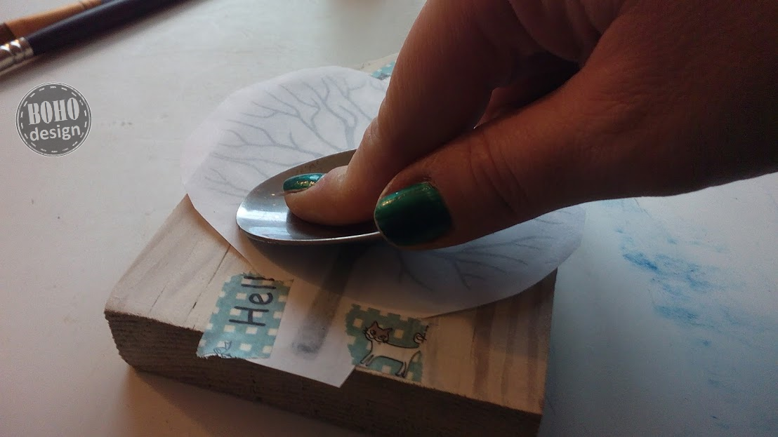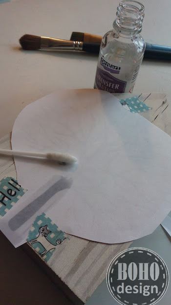 Ráfektetem a papírt a festett vagy lecsiszolt alapra (igazából bármire lehet transzferálni, üvegre, textilre stb), odaragasztom ragasztószalaggal (nyomtatott fele a festett felület felé néz) és itt jön a lényeg: fülpiszkáló végét épphogy belemártom a transzfer folyadékba (Petntart Transfer Solution, de lehet tiszta levendulaolaj vagy Almawin is), leitatom a felesleget egy papírtörlőn és finoman áthúzogatom mindenhol, ahol minta van. Egyszerre kis felületet itass át! Tényleg kevés oldatot használj, igazából minél kevesebbet, annál szebb lesz. Sok oldattal a tinta elfolyik.